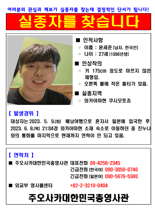 ▪【緊急】行方不明者を探しています【駐大阪大韓民国総領事館】