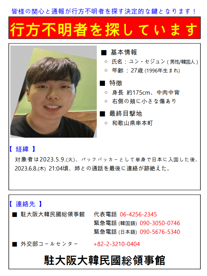【緊急】行方不明者を探しています【駐大阪大韓民国総領事館】