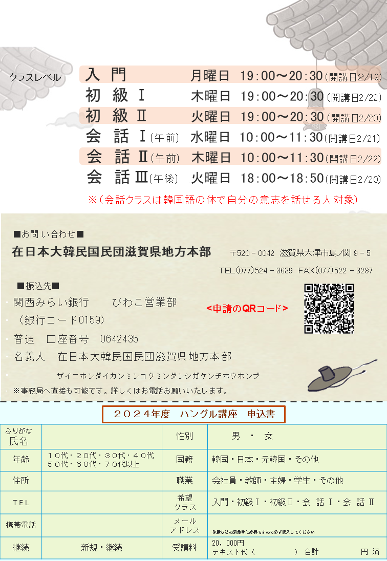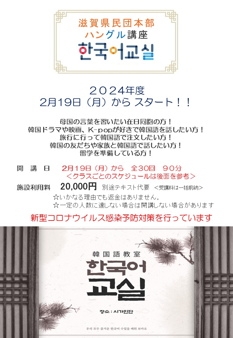 2024年度「ハングル教室」を 2月 19日 (金) 滋賀県韓国人育英会館で開催します!
