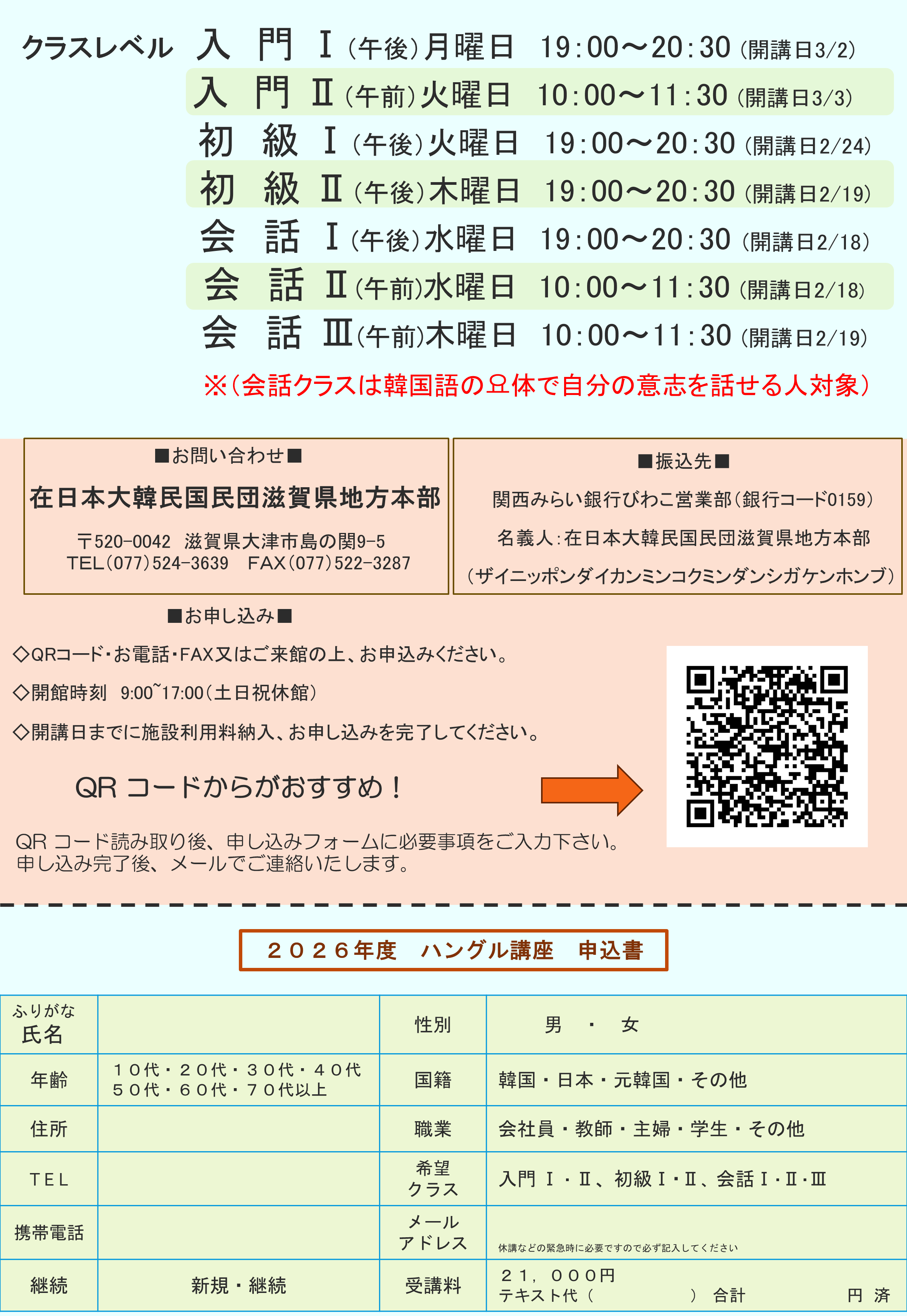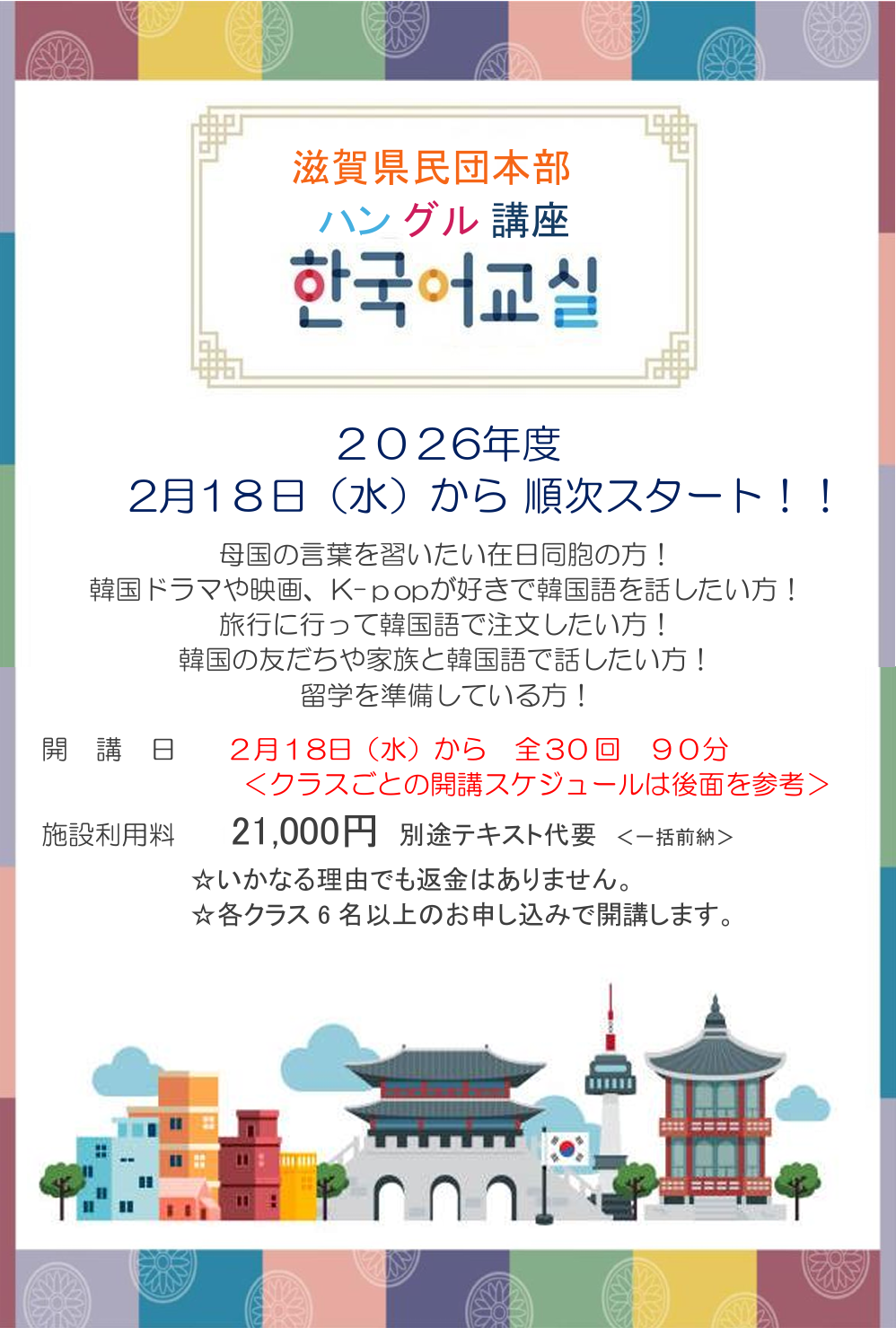 2026年度「ハングル教室」を 2月 18日 (火) 滋賀県韓国人育英会館で開催します!