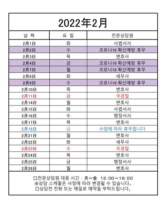 신종 코로나바이러스 감염 확산 예방 대책의 일환으로 2/1~2/10 의 업무 일정이 변경되었습니다.