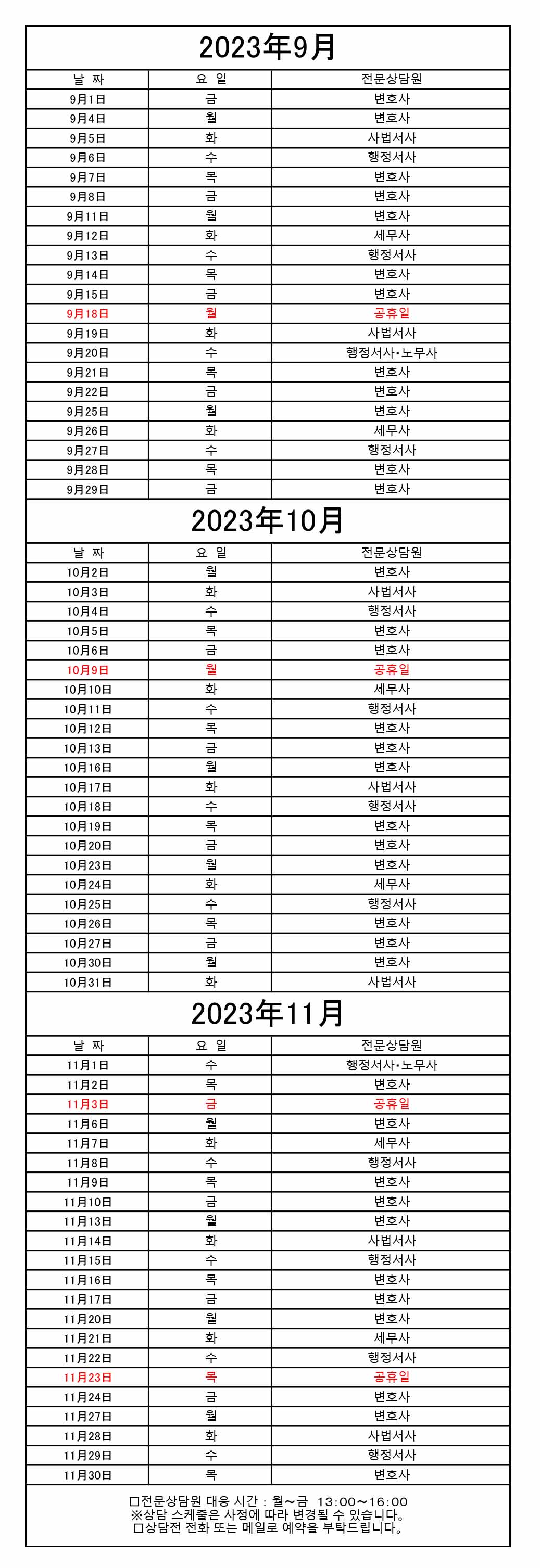 2023년9월-2023년11월 생활상담센터 전문상담원 당번표