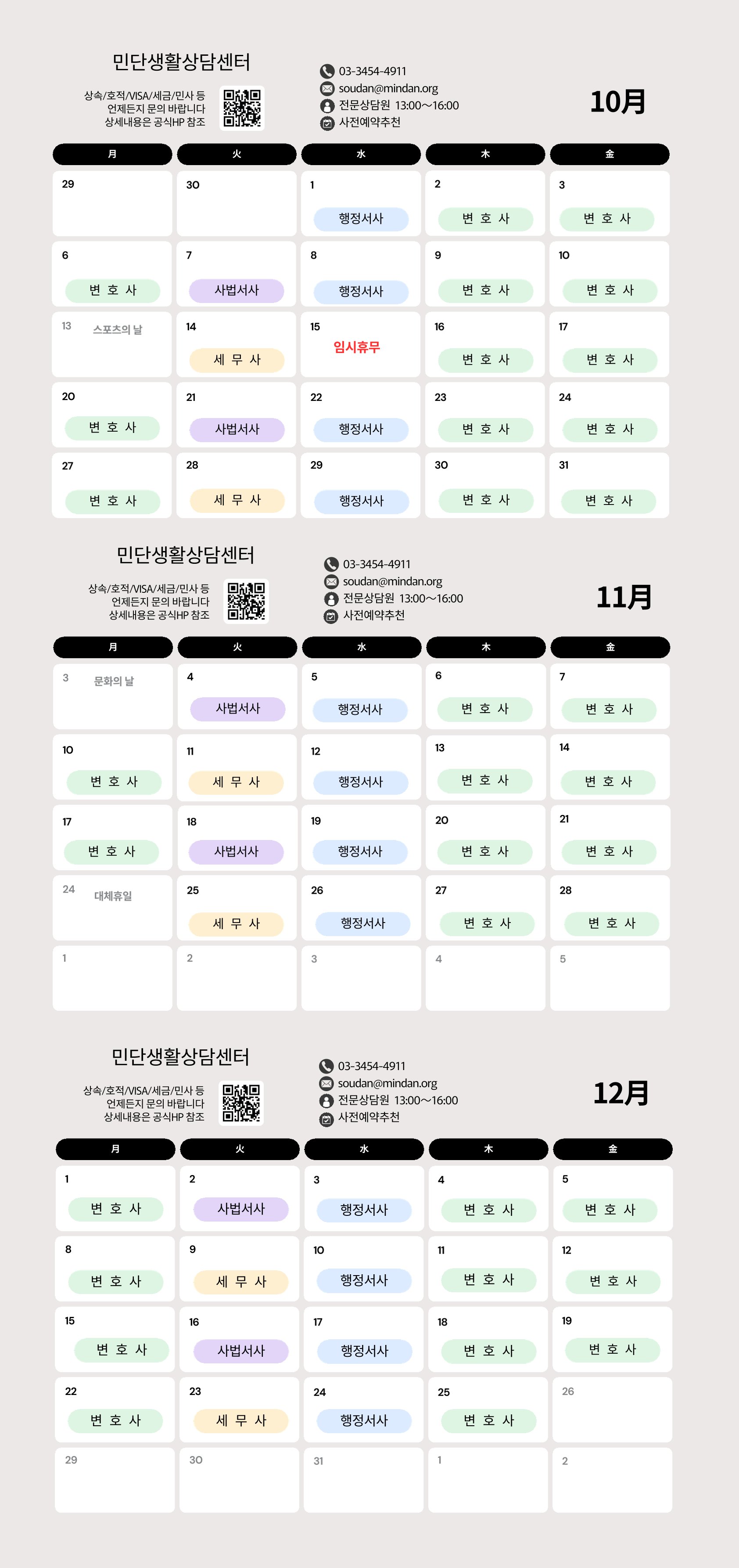 2025년10월-2025년12월 생활상담센터 전문상담원 당번표