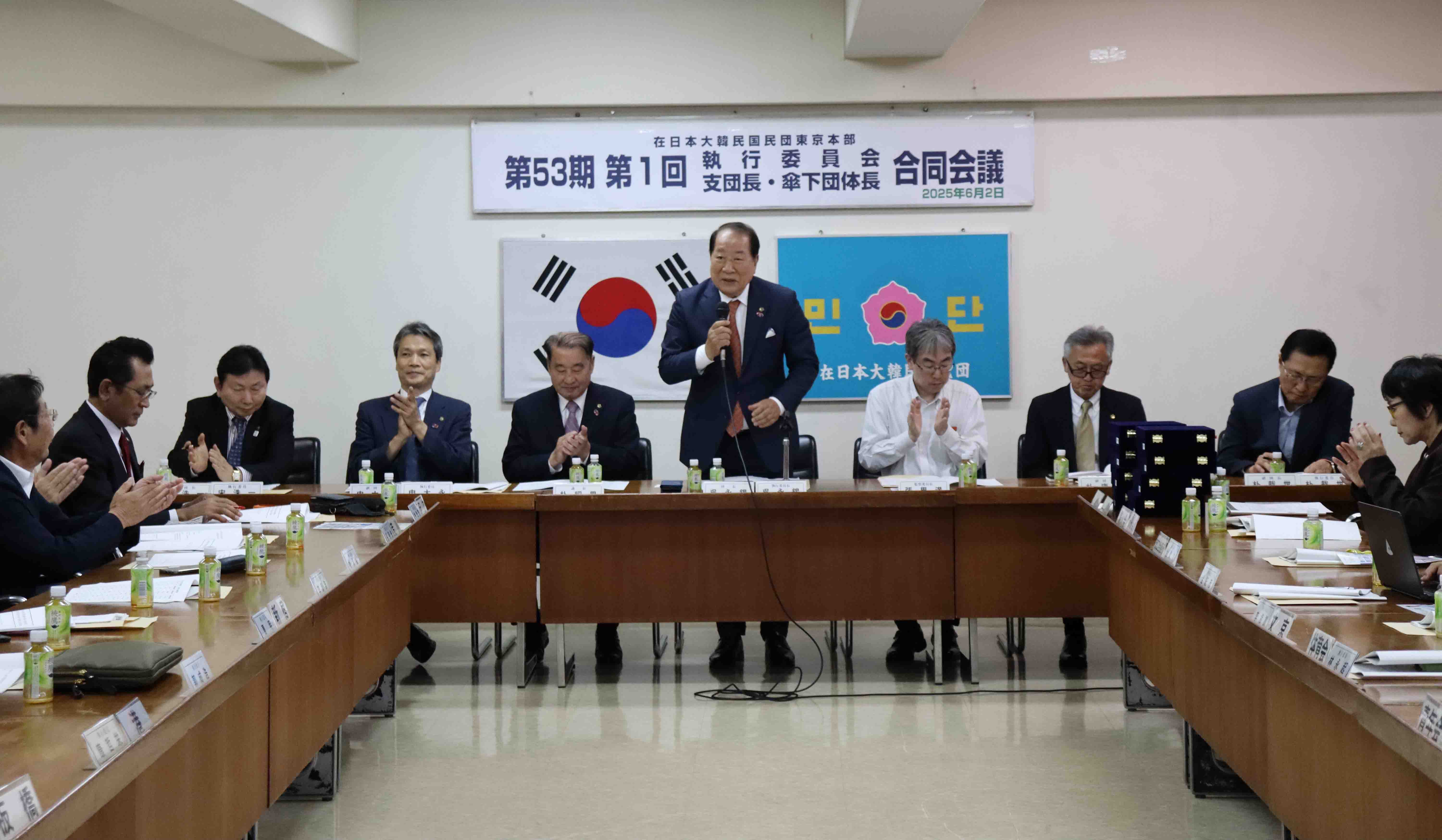 6月2日 (月) 午後3時より、民団東京本部(呉永錫団長)は、第53期第1回執行委員会ならびに第1回支団長・傘下団体長合同会議を中央会館8階小会議室にて開催、執行委員19名(定数20名)、支団長・傘下団体長をはじめ総勢69名が出席した。