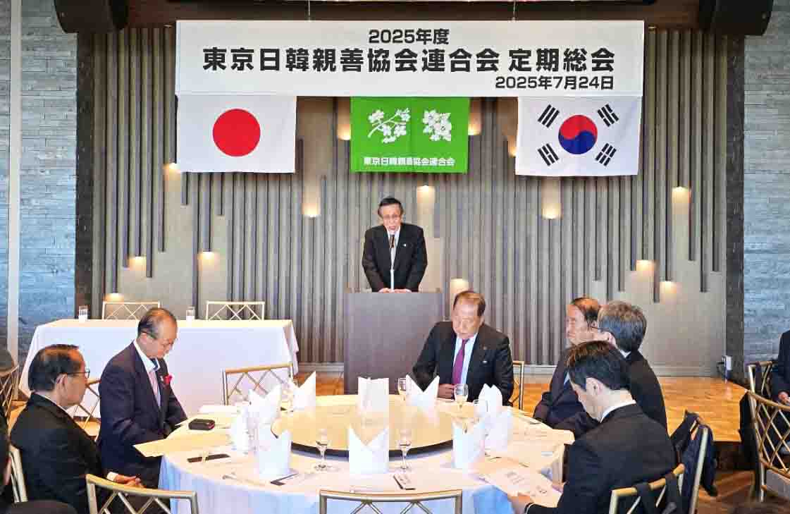 東京日韓親善協会連合会(保坂三蔵会長)は、2025年度定期総会を7月24日、上野・東天紅にて開催した。日韓親善協会、民団東京本部および各支部、傘下団体の幹部ら約120名が出席し、盛大に執り行われた。