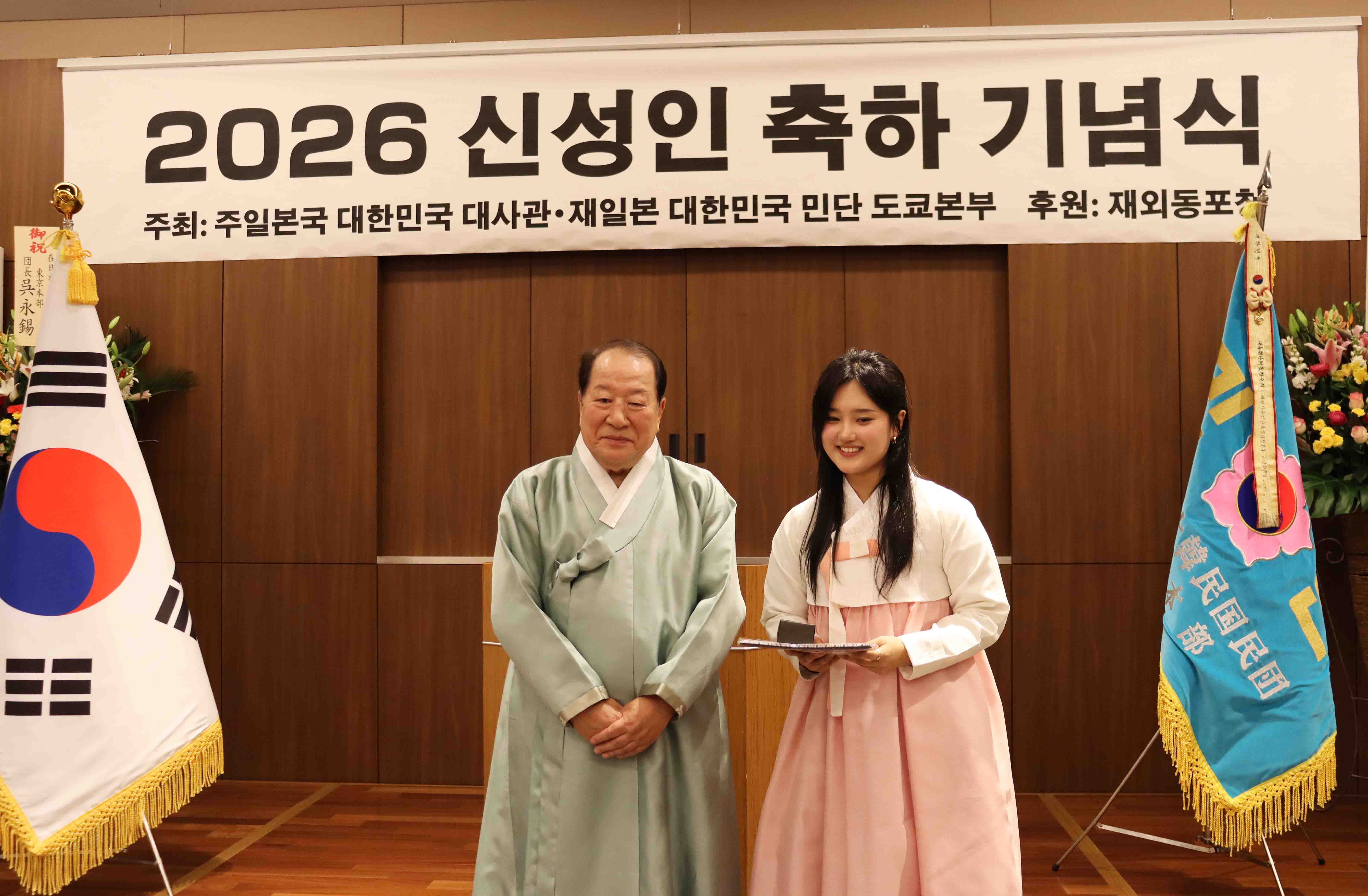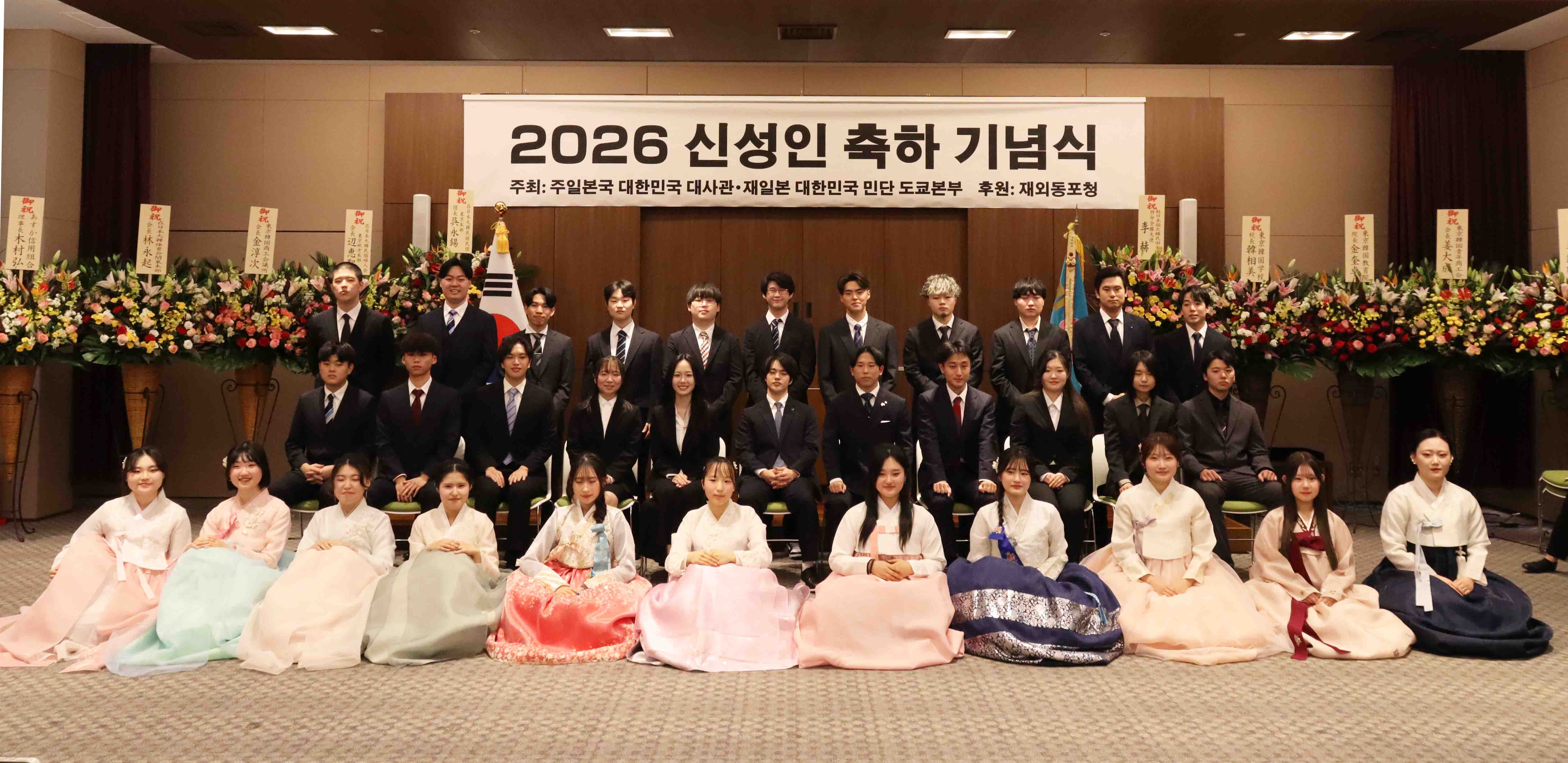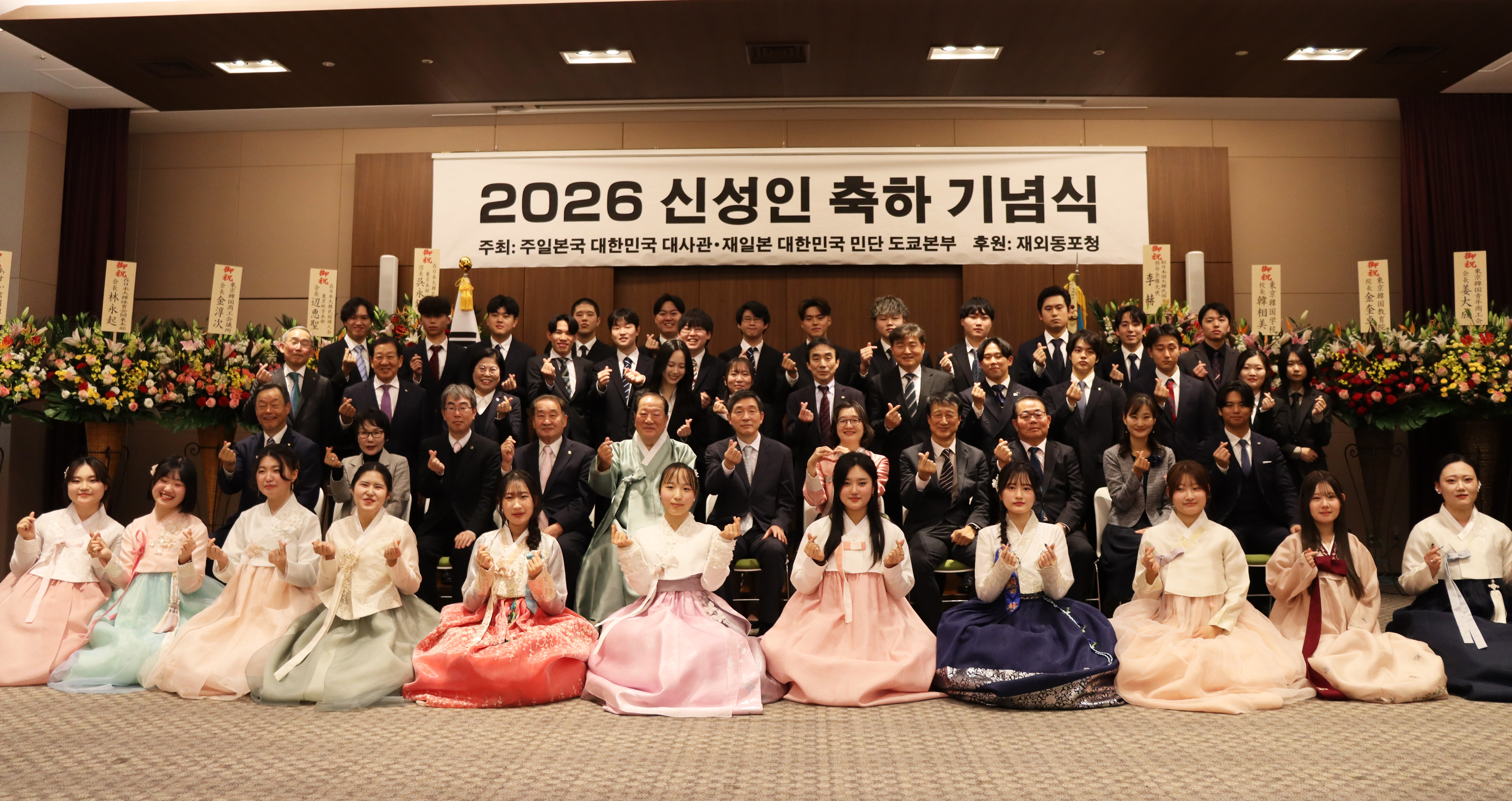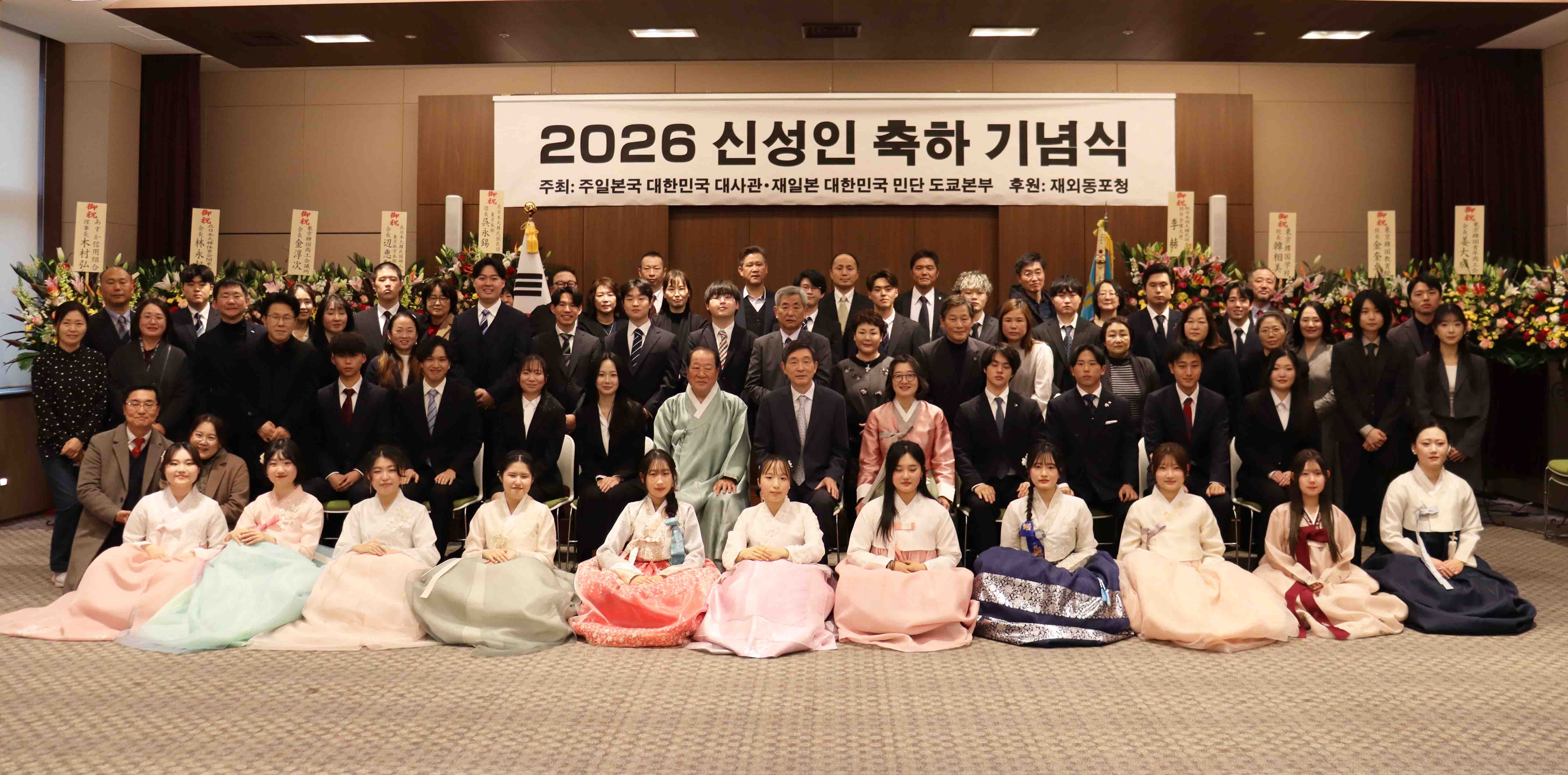 民団東京本部(呉永錫団長)は駐日韓国大使館と共催で「2026 在日韓国人 成人式」を開催、新成人37名を含む130名が参加し新成人の門出を祝った。
