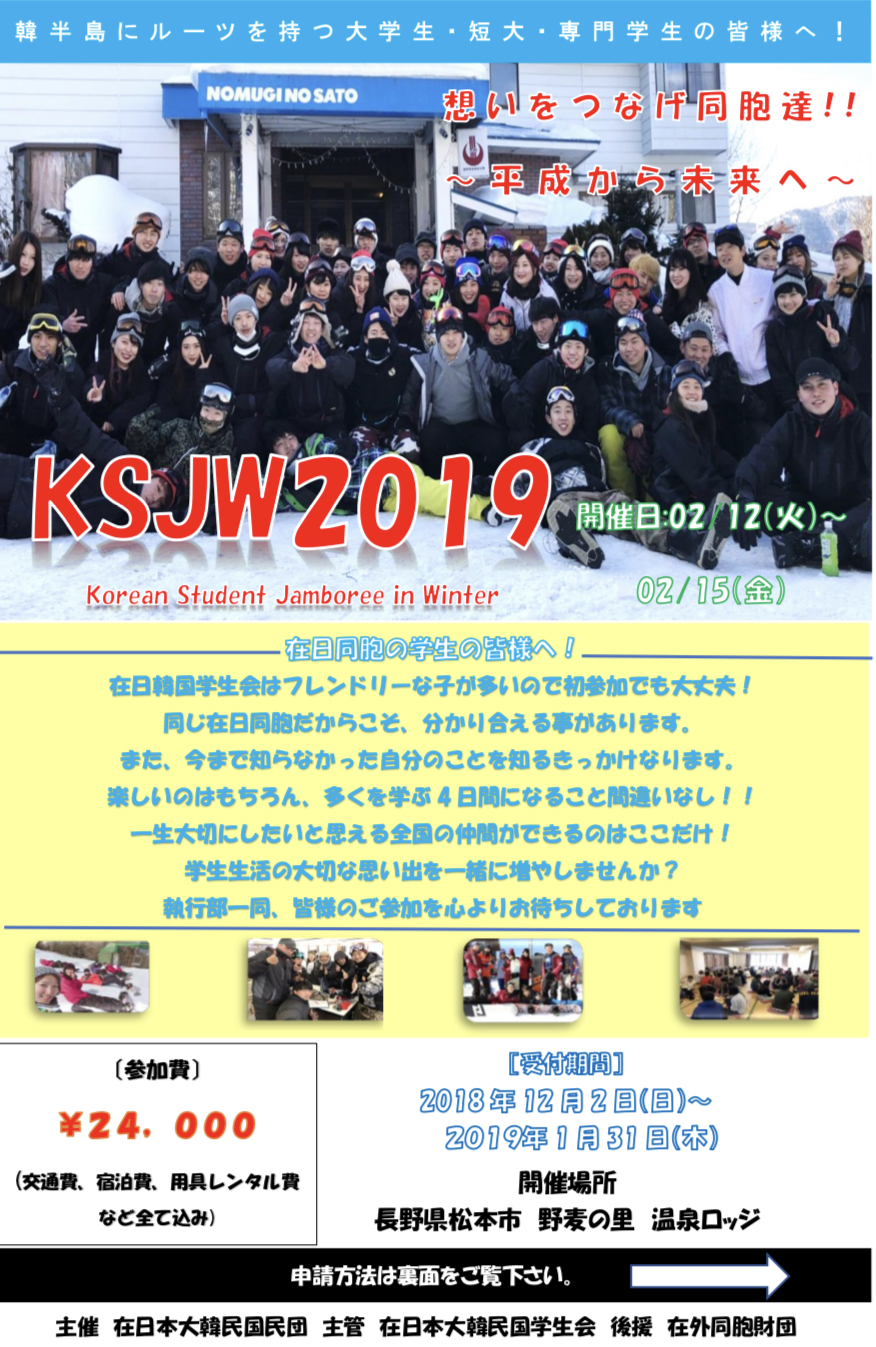 KSJWは Korean Student Jamboree In Winter の略であり中央、東京、愛知、大阪を中心とした全国の学生が合同で行う全国規模のイベントで、3泊4日間"共に"過ごし、"共に"学び、"共に"遊びます!!